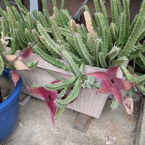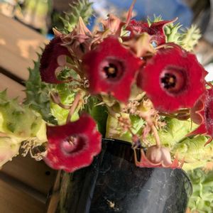 ガガイモ科スタペリア😍 あるお店の前でたくさんのヒトデが咲いてた💞 一年中軒下で沢山の花を付けるらしい✌️ 特別な管理や植替えなどもしていないそうだ😄 4枚目は若い女性に手の甲にドラえもんのシールを貼ってもらった🥰 擦れば取れると言われたが風呂の中で擦っても取れなかった😂