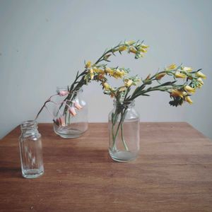 捨ててしまうのは可哀想。 多肉の花を花瓶に挿して、今季おかわり3回目です。① ほったらかしで庭に咲き出しました。 オルレア。② ご近所さんにいただきました。③