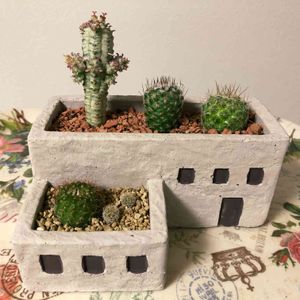 初めてサボテンの寄せ植えを作りました♪ 一部サボテンではない物も入ってますが…😁 ビニール手袋をしたら、トゲもへっちゃらということがわかり、これから色々作ってみようかなぁ…と思います!