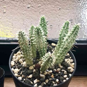 こんにちは😃 本日、園芸店見学の予定が… 連れ帰ってしまった😭🎶❤️😄 ホワイトゴーストが小ぶりのためだけに 値段も手頃、赤系のハルオチア、五角の鸞宝玉、 いずれも興味があったため、つい… ミルクブッシュビール🍺より安かったし、 ラジエターみたいな表装に引かれてしまった。 しかし、この子の名前がわかりません😢 ということで、お住まいを作るのに大変でしたが、どうにかなったものの、もう無理です😵