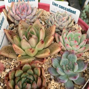 おはようございます😊 真上から見ると花時計みたいに見える😃 Lierさんの2周年記念セットの多肉たち。脱落苗もあったけど、みんな元気に育っています🤗 5ヶ月前(2020.10.24pic)と比べると、葉の色が変わってきてる。これから紅葉もさめて、緑色になっていくのね💦