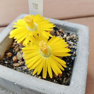 リトープス招福玉の花が、咲きました🤗 今年の春、脱皮して分裂した仲良し双子ちゃん、黄色のお花もおそろいです😊