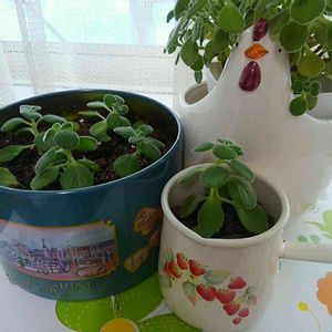 水挿しで根っこが生えたアロマティカスを空き缶とキッチン雑貨に植えつけました🌱 イチゴ🍓模様のバターウォーマーにはハイドロボールを入れてます💚 元気に育ってね✨ コッコさん🐔に入っているのは親株のアロマさんです😊