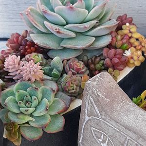 うちの子達がグリーングリーンしててなかなか丸っこくなってくれないのはひとえにお日様が足りないから。って事で明るいお庭の実家に贈る予定の子達をまとめ植え〜。 赤いのは貰った子。かわいい(*´˘`*)♡