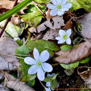 湧水が染み出している林縁の斜面に落ち葉にうもれるように咲いていました‥☘️🤍☘️ スハマソウ(キンポウゲ科) ミスミソウ属 ①②③④ ミスミソウに似ています~葉は三角形で肉厚、3浅裂し裂片の先が丸くなるのが特徴…花弁状に見えるのは白い萼片、緑色で萼片のように見えるのは総苞片で白い萼片を支えています‥☘️🤍🤍🤍☘️ ② 花弁状の萼片の数は6~10と変異があるようです‥👀🎶