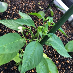 ビックリ仰天ε٩( ˙◊˙ )۶з 去年からの冬越しピーマン🫑です✨ 冬の間も室内で実らせてくれて、春先にもうお別れねと途中で幹の部分を切ってベランダにそのまま置いていたら、途中から新芽を出しこの様に立派に成長しました✨ こないだの日曜日に植え替えて、今朝花を確認しました😃 右にも去年からの ジャンボピーマン 健在です👏