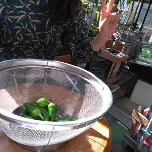 収穫〜! 娘が 手伝ってくれます。 まずは ピーマン! 渋めの割烹着…