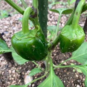 畑でほったらかしのピーマン。 もう終わりのサインかな😅 なんの形に見えるかしら…
