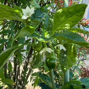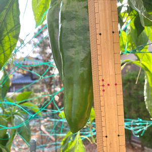 🫑ピーマンもそろそろ終わりだから赤く色づかせようかなと 収穫せずに待っていたら どんどん大きくなって肉厚の巨大ピーマン🫑になりました。 収穫しないピーマン🫑🫑🫑たちはまだまだ成長中✨ 朝晩寒いのにがんばっています。 大きくなる品種だったのかなぁ😆