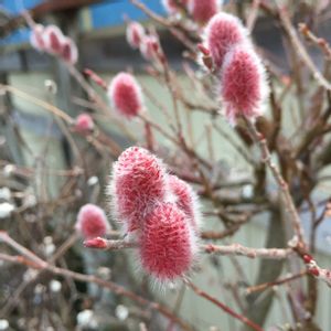 風雨、時々雪に耐えている ピンクのねこやなぎ💗
