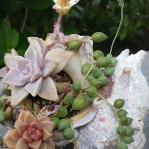 こんにちは☀️ 去年サザエの殻に 寄せ植えした多肉 元気に成長 朧月にお花が咲き グリーンネックレスには蕾 楽しみ