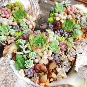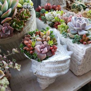 サザエの殻を白く塗り、寄せ植えました🐚 不安定なので、飾る角度に悩みます😅 とりあえず日当たり重視で💡