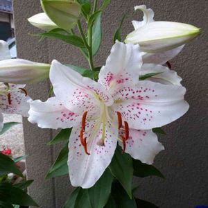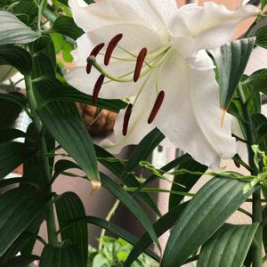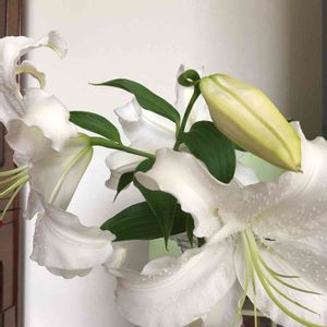 春先に、目が出た鉢植えのカサブランカのポットを買いまして、ダメ元で育てておりました😊 三月に買った時は発芽5センチほど。 今、満開を迎えております😊 全部で、6つ花が咲きました😊 とっても豪華です😊 小さな蕾がまた先端から出てきておりまして、 毎日眺めるのが楽しみです😊
