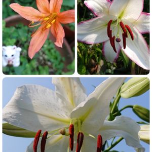我が家の百合祭り、これで終わりかな? ↗️上向きオリエンタルリリー ホットライン 茎が細かったから、開花は無理かと思ってたら健気に開花😺 ピンクのラインがラブリィ💕 ↖️キツネノカミソリ 百合じゃなくヒガンバナ科だけどゴメンナサイ💦 咲き始めたこの花弁が6個集まって一輪なの😸 いつもはお盆頃に咲くのに、早いなぁ🦊 ⬇️カサブランカ 去年の秋に新しく植えたの😺 流石の華やかさ😻上に8個蕾があるけど、1個虫に噛まれてるぅ😿😿 もう1球は蕾もついてない😿😿