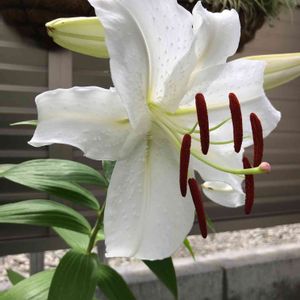 カサブランカが咲きました 暮れに球根を植えて7ヶ月待ちに待って やっと今日の薄い陽射しを受けて開花!