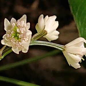 板橋赤塚植物園に行って来ました 🤍芹葉黄蓮(セリバオウレン)🤍 キンポウゲ科オウレン属 花は1cmほどの白くて可憐なお花です ①②③両生花‥中央に緑色の雌しべがあり、その回りに雄しべが外に向かって広がっています ④雄花‥‥雄しべと退化した雌しべがあります 雌雄異株のものと同株のものがあるようで、ここの植物園の株は同じ株から両生花と雄花を付けています 雌花(雌しべだけで雄しべが無いもの)は無いようです 葉がセリの葉に似ている事からこの名前が付いたようです 葉は枯れる事なく年間を通して付いているので🧚スプリングエフェメラルではありません