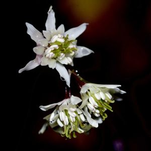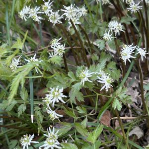 【セリバオウレン(芹葉黄蓮)】 日本原産、キンポウゲ科多年草 本州、四国の山地に分布する。 小葉がセリの葉のように切れ込む。 花茎を伸ばしてその先端に1~3輪の白い小花を咲かせる。 花径1cmほどで、萼片は5~7個、花弁は8~10個。 雌雄異株で、雄花、雌花、両性花が存在する。 根茎を干したものが生薬の黄蓮で健胃剤や洗眼薬として用いられる。 草丈:10~15cm 花期:3~4月 花色:白 pic1:両性花、pic2:雄花 山野草のエキ@周南市