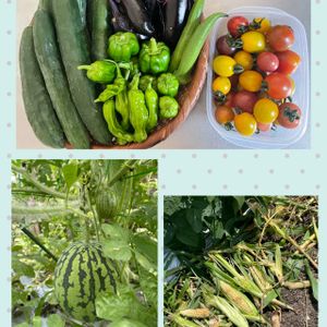 ボイセンベリーが熟してきました🖤①② 強力な抗酸化作用のあるアントシアニンなどのポリフェノールが多く含まれ、がんや老化の抑制があります 冷凍庫に保存して毎朝ヨーグルトに入れます😋 ③←空芯菜と、↗黄色小玉スイカ第2号、↘小玉黒皮スイカ🍉第1号(フェンスに絡んでいたツルが重みで切れて自然に落下💦) ④集合写真にボイセンベリーが加わりました🙌