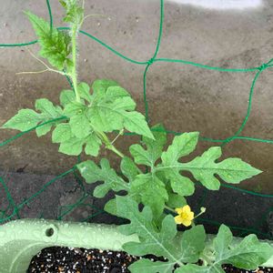 グリーンカーテンにしている小玉スイカ🍉 グリーンカーテンとしてはまだまだですが、今日はじめてのお花が咲きました✨ これは雄花のようですし、まだ雌花も見当たらないので、受粉はできませんが、やっぱりお花が咲いてくれるとうれしいです😊 蔓もようやくネットにしっかり絡んでくれるようになりました🎶