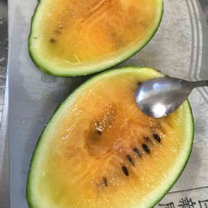 せっかく育っていたスイカが、割れてしまいました(T . T) 3個中、2個も割れててショック。大雨のせいでしょうか。 大きさも直径7センチくらい… でも、割って見ると黄色! タネも黒! ちゃんといただきました(^O^)ほのかな甘み。割れなかったらもっと甘かったのかな?と、思いつつ、残り1個の成長を楽しみにしています。