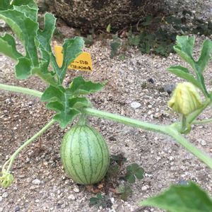 初めてスイカに挑戦。気づいたら実がなっていました! 可愛いなぁ〜💕 ちゃんと育つのでしょうか。心配。 狭い所なので、上から吊るせるよう棚を作ろうかと考え中です。