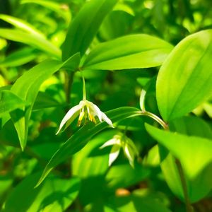 【稚児百合】《ユリ科》 花言葉 「恥ずかしがり屋」「純潔」 ユリ科の中で最も小さな花 花の大きさは1cmほどです 花色はやや緑がかった白色で 花びらは6枚。 うつむき加減に咲く花は とても可愛らしいです 小さくて可愛らしい花姿を “稚児(ちご)”に見立てたことから「稚児百合(チゴユリ)」という名前がつきました。