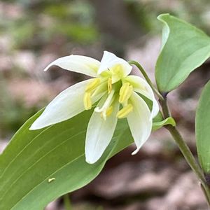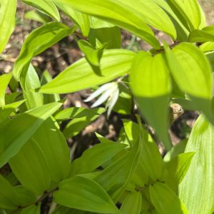 チゴユリ 小さく白い可憐な花 下向きでひっそりと咲いています。 花言葉;恥ずかしがり屋 純潔 25/04/20 市川万葉植物園にて