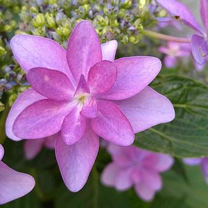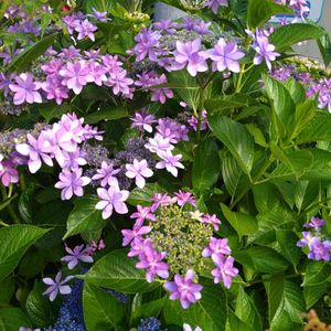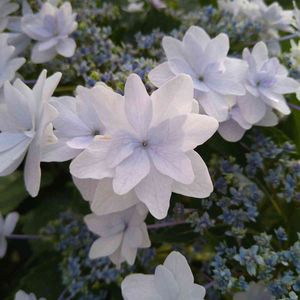 ガクアジサイ ダンスパーティー 萼片が八重に重なった装飾花が華麗❣ 花の色は土壌の酸性度で変化 アルカリ土壌だとピンク 酸性土壌だと淡いブルーや淡い紫