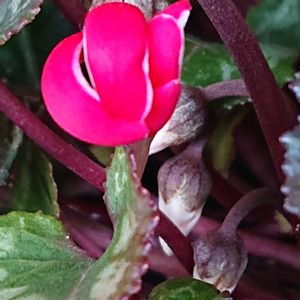 シクラメン🌺☘️ カール 先日 値引き品で迎えました。 花弁は退色していましたが、蕾はあるので楽しみです✨❣️ 小さいながら真っ赤な花弁が目立ちます。