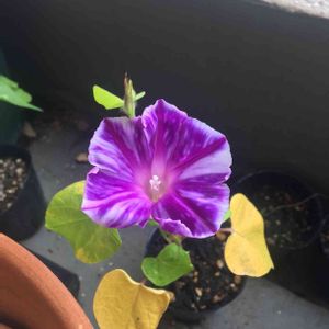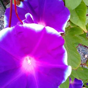 🗾日本朝顔 常葉車絞丸咲(つねば くるましぼり まるざき) と 紫御殿(むらさきごてん) 常葉は、ごく普通の朝顔の葉 車絞は、花びら内側の模様が星形というようです。 ちなみに、ハート型の葉は、 孔雀葉というようです。何かカッコいい✨ 畑のおにいさんがくださった朝顔のタネを9月に撒いたものが開花しました🙌