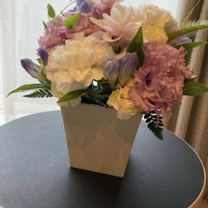 +hanaさんの今週の定期便のお花です。 今回バランスよく生けるのが難しくて、花瓶を4つくらいかえて試行錯誤しながら生けました。