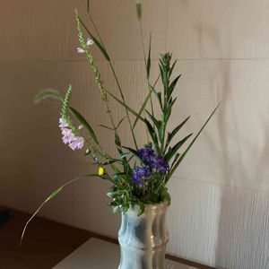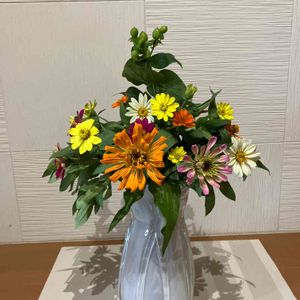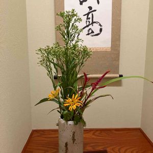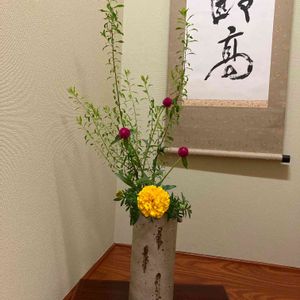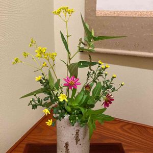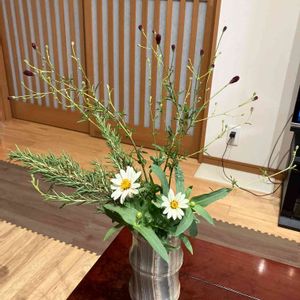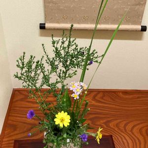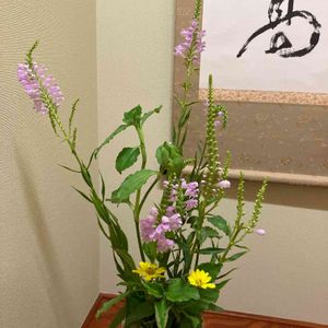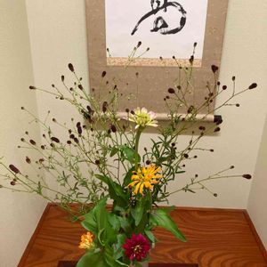 吾亦紅が雨☂️☔️でた折れそうだったので和室にお迎えしました。花は相変わらずジニアです。