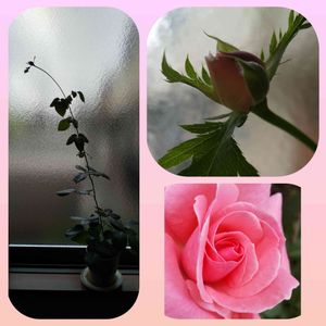 5月に咲いた地植えの薔薇(右下画像)が花瓶で発根したので鉢に植えたらどんどん成長(左画像) 蕾が💕 ヒョロリと60センチ位に伸びて蕾は1.5センチ… 栄養失調😅