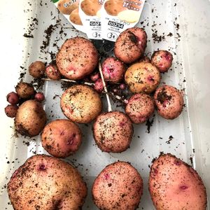 上 ジャガイモメークイン🥔 2個から35個 下 ジャガイモキタアカリ🥔 2個から29個 (小さな食べられるサイズまでカウント) 4/4植付、6/12第1回フライング収穫、7/3最終収穫 ベランダ7ガロン不織布プランター ジャガイモ初栽培 なかなか葉が色付かずプランター不足のため、やむなく収穫。初チャレンジでは上出来?、想像よりは少量😅