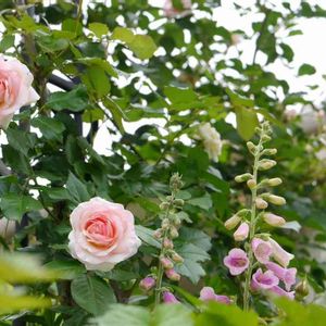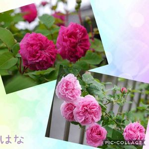 我が家のオールドローズは2本だけです。 紫玉は挿し木で頂いたものが元気、元気❗ ルイーズは見ての通り、細い枝に花がビッチリ付いているため、自立出来ずに縛っています。 恥ずかしくて全部撮せないです😂