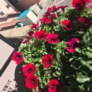 おはようございます☁️ サフィニア JAPANレッド🌸 いつのまにか満開になってました❣️ 通りに面したところに置いてあるので、道ゆく人に見てもらって、お花も頑張っているのかも😊 今日も良い一日になりますように✨