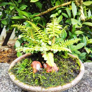 おはようございます☁️、昨日最後の囲いしてました。平鉢に赤石とシダに苔、自家庭生え取り品😄そろそろ囲いに移動します。