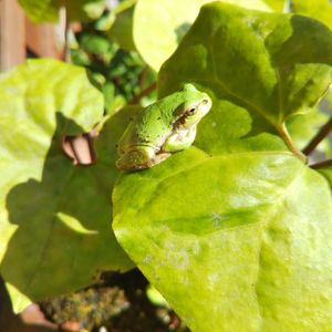 今日も朝からご覧の天気☀️ウスバサイシンの葉に🐸ビッキ❗️朝七時で30度超え😨直射日光はそれ以上👀目を開け太陽見つめ日光浴🎵肌色変わるのかな⁉️朝の水やりは😊根本にそ〰️っとやりました。まだ動きません😓 虫の食べ過ぎで動けない😨