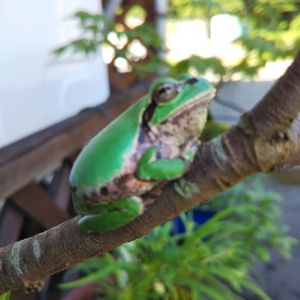 おはようございます☀️八時日陰の駐車場27度😳ここもそのくらい❗️陽当たりはゆうに30度超えてます。沈丁花の枝でお休み、眼がうつろのアマガエル、起こしていません。