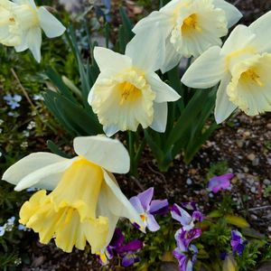 🌸ラッパスイセン🌸 突然現れた新品種!? 普通のラッパスイセンよりも大きくて 咲き始めは手前のよりもラッパ部分が真っ黄色でした😊 だんだん色が薄くなってクリーム色になってますが ひょっとしたら もっと白くなるのかな? 普通のラッパスイセンを 他の場所から移動させただけなんですが 肥料の関係かな? 違う品種に様変わりしてきました😆 (マウントフットという品種に似てますね)