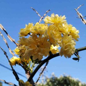 🌸モッコウバラ🌸 うちのモッコウバラは午前中のみの日当たりのせいか、開花が遅れてますね。 でも青空バックに可愛い姿💗 枯れたニシキギの枝に乗っかってます😅 まだ3割開花なので 満開の全体をまた 載せたいと思います🤗
