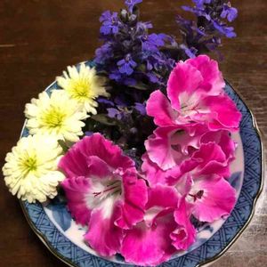 母が庭の花で作ったものです。 小鉢に水を入れてさしてあります。 可愛い色合いなので誉めたら、娘が行ったときに見せてくれたそうです。 こんな時期なので、お花で楽しんでいるんでしょうね!