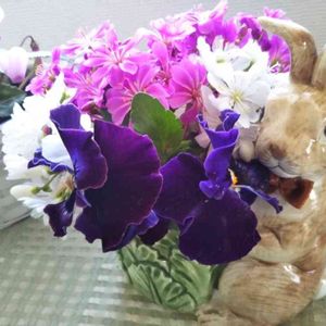 暴れまくる🌸レウィシアとパンジー🌸 切り花を🐰うさぎさんの陶器ポットに入れました💕 玄関が明るくなりましたね😃