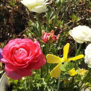 💗穴あきラナンキュラスのその後 つぼみの時に穴あきにされてしまいました😅(2/25) が、その後普通に大きくなるにつれて 穴の位置もズレていき ほとんどわからなくなりました🤩 🐦鳥よけに風車をさしました! ぐーるぐるとよく回りますよー💖 このラナンキュラスは 2番花3番花で だいぶサイズが小さいです😅 1番花はダメ元でドライにしてます🤣