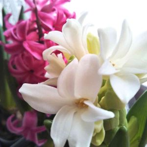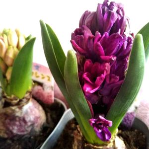 🌸ヒヤシンス🌸 赤紫色のが咲き始めました! 毎日、すこーしずつ 大きくなってきて 気づけば花びらがほころんでました! 左手ピンクのも遅ればせながら伸びてます😃 右手に白いのがあるけど😅伸びないなー😆 3色同時開花は無理なのかもね😅 これは3週間前に芽出し球根で買ったものです。