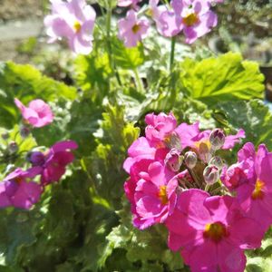 🌸🐝日向ぼっこ🌸🐝 去年よりも寒いので つい、夜は簡易温室に入れてしまってるけど 暖かい昼間は日光浴😀 🌸プリムラマラコイデス 🌸八重咲きストック ロイヤルベイビー 🌸アネモネ オーロラ 密に並べてみました🤩
