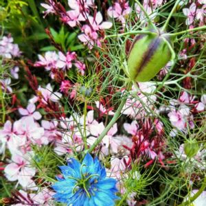 青いニゲラと ぷくぷくに膨らんだ種! 背後にはガウラがたくさん😆