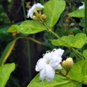 🌸アラビアンジャスミン🌸 マツリカともいいます。 2年目の株なんですが 本当に芽が出るのが遅くて 連休明けまではやきもきしてました😅 やっと梅雨の雨粒をまとっての開花🌸 つぼみも沢山あるので ヤレヤレですー!