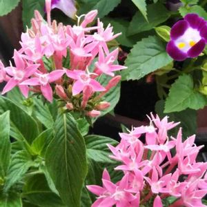🌸ペンタス🌸 越冬してくれたペンタスのピンクが満開です💕 背後にはトレニアの赤紫色の。 白いペンタスは枯れたのが残念です😅