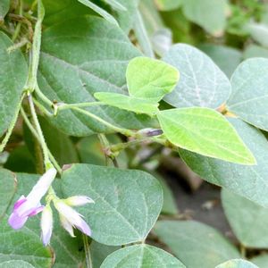 我が家のお庭に自生したヤブマメさん。 四角い葉っぱの三ツ葉の新芽が可愛くて フェンスに誘引していたらお花をつけました🌸
